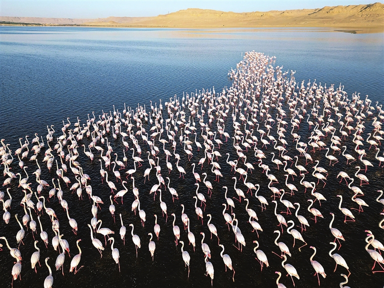 这是12月6日在埃及法尤姆省加龙湖拍摄的火烈鸟(无人机照片)。每年冬季,大批火烈鸟会飞抵埃及法尤姆省内的加龙湖觅食越冬。新华社发