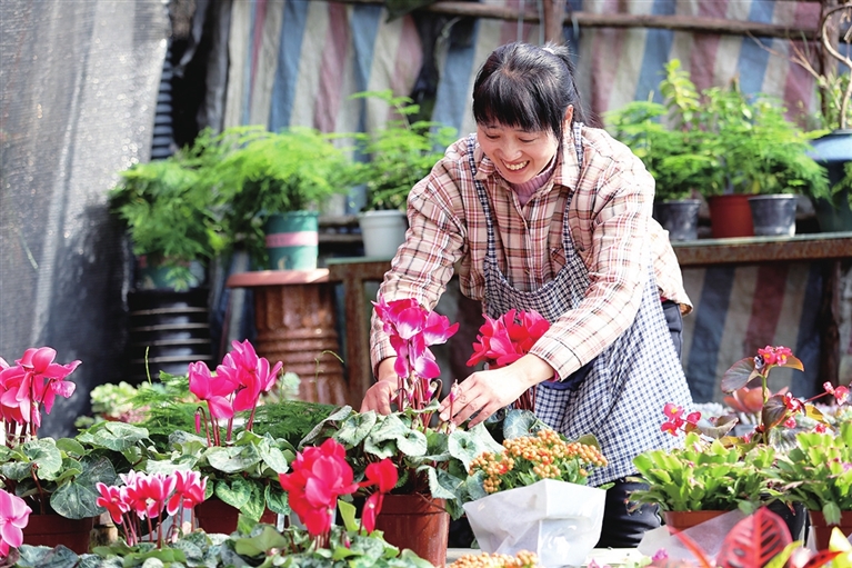 12月7日,在四川省乐山市牟子镇花卉种植基地,花农在管护花卉。