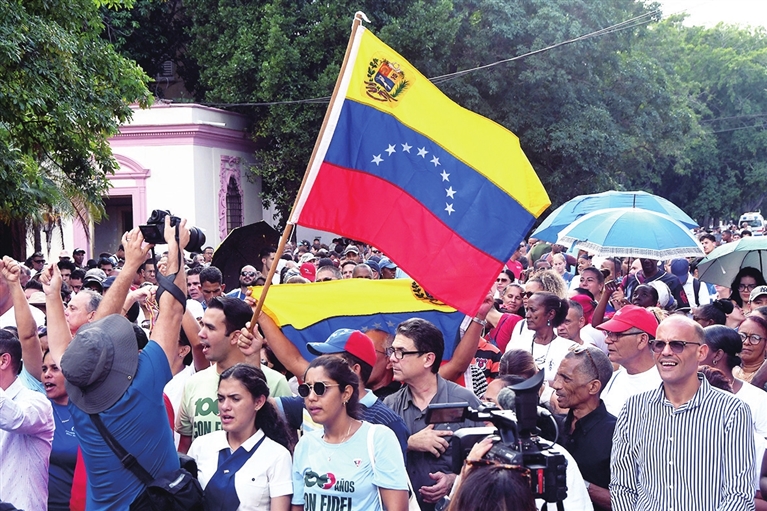 古巴各界民众近千人6日在首都哈瓦那举行集会,谴责美国针对委内瑞拉的军事威胁与制裁封锁,并重申对委内瑞拉政府的支持。新华社发