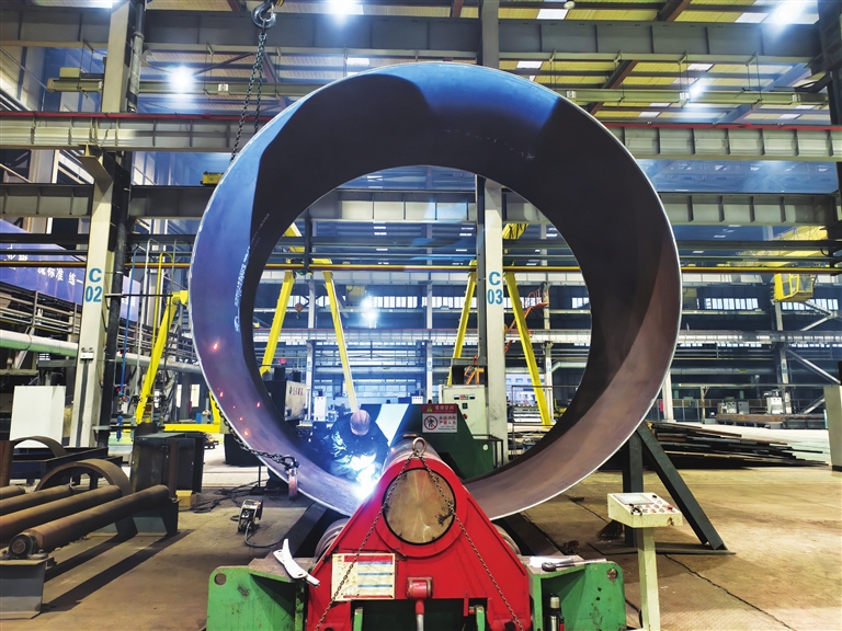 12月9日,山西转型综改示范区山西钢构科工有限公司钢结构智能制造车间内,工人们争分夺秒赶制订单,努力实现全年生产目标,保障重点项目。图为工作人员在进行卷圆作业。王韵菲 摄