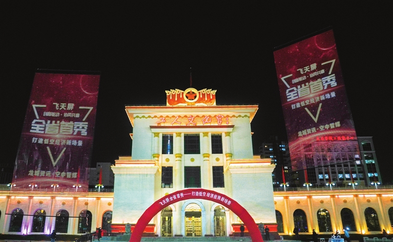 12月8日晚,太原无线电一厂在太原工人文化宫广场举办“智御低空·屏显未来”新业务发布会暨飞天屏首秀,标志着该企业主动投身新赛道,拥抱低空经济。图为由无人机牵引的电子软屏点亮夜空。