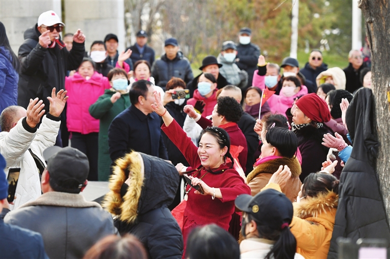 12月9日,迎泽大街一处小游园内,市民们在暖阳下跳舞健身,充满活力。邓寅明 摄
