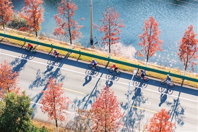 12月7日,在安徽省芜湖市繁昌区繁阳镇范马村,自行车运动爱好者在风景如画的淮九公路上骑行(无人机照片)。新华社发(肖本祥 摄)