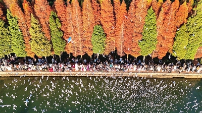 12月10日,游客在滇池畔的海洪湿地公园喂红嘴鸥(无人机照片)。近年来,昆明滇池水域的水生态、水环境持续改善,重现“景美、鸥飞、鱼跃”的生动画卷,吸引众多游客前来打卡。新华社记者 彭奕凯 摄