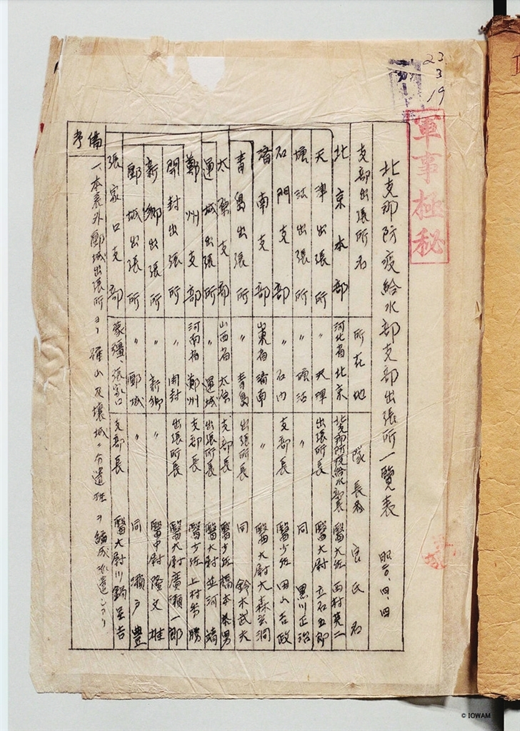 打开名簿首页,一张《北支那防疫给水部支部出张所一览表》映入眼帘。表的右上侧盖着清晰的“军事极秘”印章,表内该部队本部位于北京,下属有石门(石家庄)、济南等5个支部,天津、塘沽、青岛等7个派出机构,以及确山、壤城两个分遣班,各机构负责人的姓名、军衔等信息一应俱全。