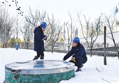 太原供水集团在全力清雪除冰的同时,进一步筑牢供水保障防线,实现“扫雪保通行、巡检护供水”双线作战。巡检人员踏着积雪,按照专项巡视路线对辖区内供水管网开展拉网式排查,重点检查井盖密封性、井室保温状况及消防供水设施运行情况,对发现的井盖积雪堵塞问题当场处置,防止融雪倒灌影响管网安全。针对户外的关键井室,工作人员紧急铺设保温棉被,对暴露管线加装临时保温层,确保供水设施在低温环境下稳定运行。