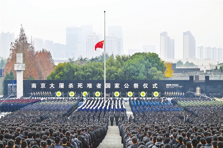 北京宛平城内,雪后的中国人民抗日战争纪念馆更显肃穆。在馆内序厅象征中华民族团结抗战的大型浮雕《铜墙铁壁》前,人们手持鲜花、肃立默哀。中国人民抗日战争纪念馆宣教专员朱宁以幸存者证言和“百人斩”罪证等,向现场众人再现南京大屠杀的历史。