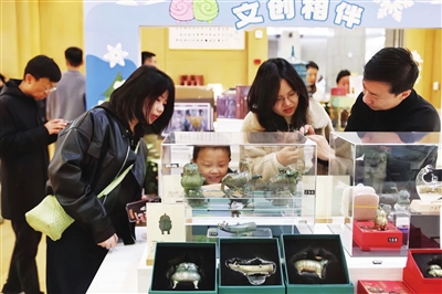 山西博物院文创商店不断探索对晋地文物元素的创新转化,持续推出特色产品,让厚重历史变得可触可感。图为12月14日,游客欣赏选购心仪的文创产品。张澍宏 摄