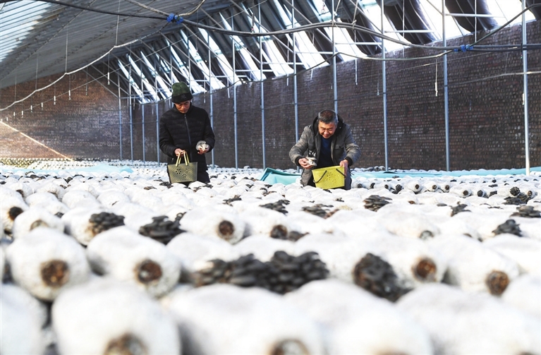 12月12日,杏花岭区山河村种植大棚内,工作人员带领着游客采摘新鲜蘑菇。该村充分利用现有生态资源,发挥地理、交通、人居环境等优势,将种养殖产业与生态旅游、科普教育相结合,带动周边农家乐、民宿等其他产业协同发展,积极探索具有地方特色的产业发展道路。牛利敏 摄