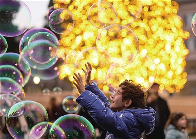 12月13日,小朋友在意大利首都罗马的人民广场玩泡泡。近日,意大利罗马的主要地标建筑和市中心街道点亮节日彩灯,为冬日增添缤纷色彩。新华社记者 李 京 摄