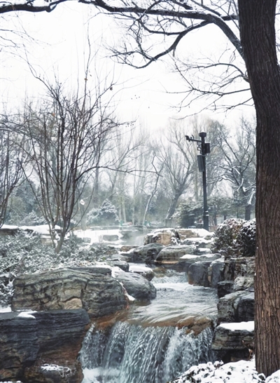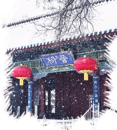 难老泉是晋祠的魂。即便在这样的寒冬,泉水依然汩汩涌着,蒸腾起团团白雾,朦胧了水边的亭台和喷水的龙头,连泉眼井上方的“难老”二字,都似浸在温润的雪色里,多了几分岁月绵长的意味。流淌的泉水中,摇曳的墨绿色水草和游弋其间的红色鲤鱼,和着雪落雪隐的瞬间独显生机勃勃。