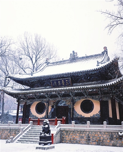 我在殿前站了许久,看雪花一片片落在汉白玉栏杆上,落在褪色的朱红大门上,落在“圣母殿”三个大字上。时间在这里变得很慢,慢到可以看清每一片雪花的形状,看清它如何在风中翻转、飘摇,最后静静融入那一片素白之中。