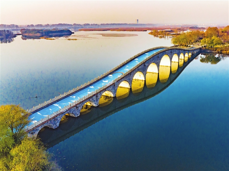 12月16日在江苏东海县西双湖国家湿地公园拍摄的十七拱桥“金光穿洞”景象(无人机照片)。
