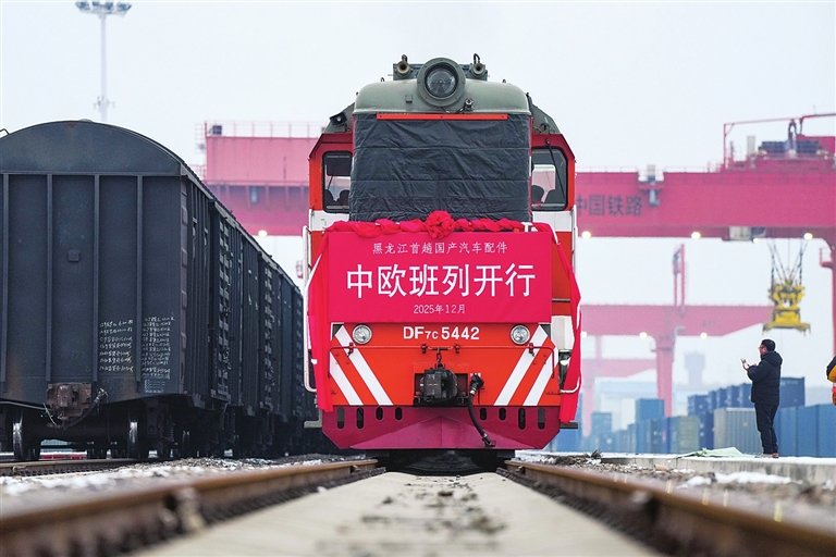 12月18日,中国铁路哈尔滨局集团有限公司今年的首趟国产汽车配件中欧班列即将在哈尔滨国际集装箱中心站启程。