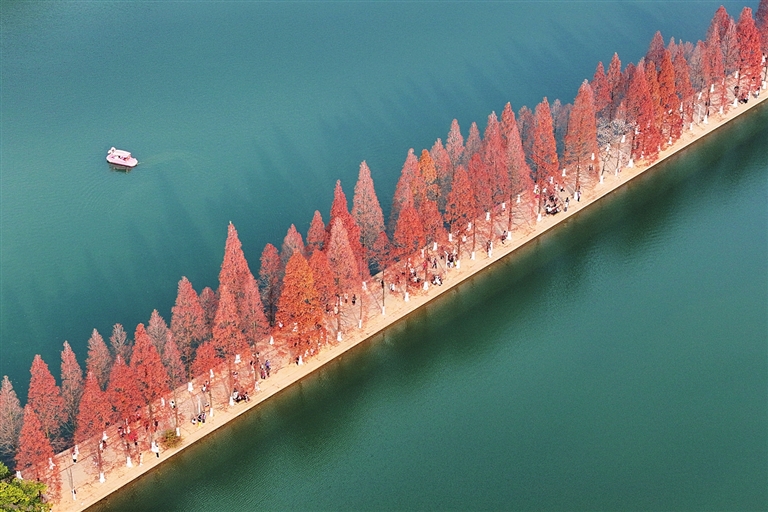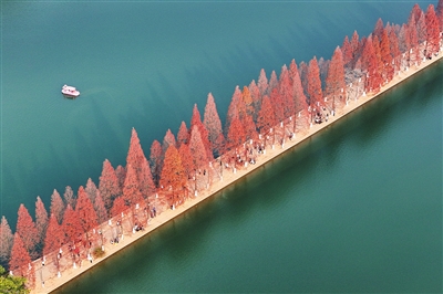 这是12月18日拍摄的长沙市烈士公园景色(无人机照片)。连日来,湖南省长沙市烈士公园的水杉树叶转红,在冬日暖阳的映照下,园内景色如画,吸引不少市民前来游玩打卡。 新华社记者 陈思汗 摄
