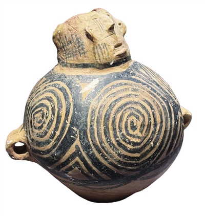 在众多展品中,一件人头像彩陶壶格外引人注目。这件陶壶出土于青海柳湾遗址,属于马家窑文化,是新石器时代晚期彩陶艺术的杰作。这件彩陶壶最明显的特征是隆起的半圆面壶口被精心塑造成一副生动的人面。人面部略呈方形,耳、鼻为捏塑而成,眼睛、耳、鼻雕空,头发、睫毛、胡须、纹身均以黑彩绘制。人像眼睛半闭、高鼻、口微张,十分生动。器身两侧有耳,上部用黑彩绘有圆圈纹5个,下部为素面。这件陶壶融合了塑、雕、绘等多种技艺,且制作精良、栩栩如生,尤其是人面上的纹身,是原始社会纹面习俗的实物例证,推测被用于祭祀仪式。