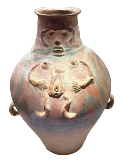 另一件引人注目的展品是裸体人像彩陶壶。它1974年出土于青海柳湾遗址,高33.4厘米,属马家窑文化马厂类型遗物。这件彩陶壶的独特之处在于腹部堆塑的裸体人像。人像双手交于腹前,头部位于壶身颈部。该人像因兼有两性生殖特征而引发学界讨论。有学者认为,这可能是远古萨满信仰中的两性人形象,是天地人神的中介。也有观点认为它反映了生殖崇拜。值得一提的是,这件陶器是我国迄今为止,发现的最早的浮雕艺术,被载入我国美术史教科书中。