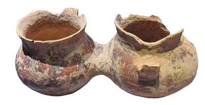 展览中还有一件造型独特的双体陶罐,同样属于马家窑文化马厂类型,出土于青海柳湾遗址。其高约11厘米,造型独特,整体呈现葫芦状,由两个相连的瓶身构成,底部相通,口沿与肩部各自独立。器表原有彩绘纹饰,但因年代久远,现已大部分脱落,仅存零星色彩痕迹。据推测,此罐在原始社会晚期主要用于部落间的和解仪式:双方首领通过共饮此连体罐中的酒,消除仇怨、订立盟约。这一功能后来逐渐演变为古代婚礼中夫妻共饮的“合卺”礼俗,成为象征婚姻结合的重要器物。