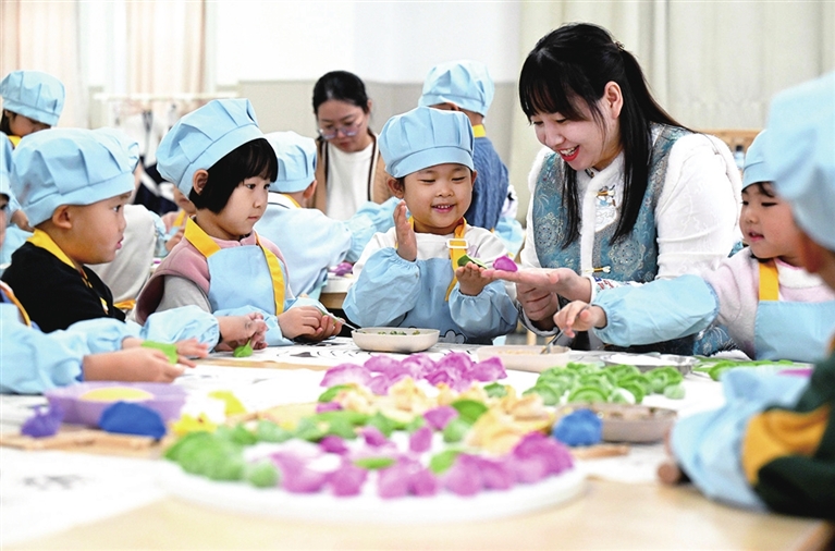 12月19日,在河北省石家庄市新华区第一幼儿园,老师指导小朋友们包饺子。临近冬至,各地开展包饺子迎冬至活动。新华社发 (陈其保 摄)