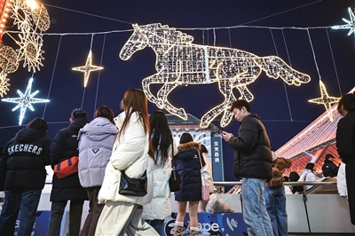 12月20日,行人从北京西单商圈的一处马形象灯饰前经过。