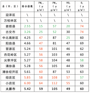 1.综合指数、PM10、NO2和O3指标排名前两位的标为绿色,排名后两位的标为红色;