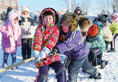 12月24日,呼伦贝尔额尔古纳市第三小学学生参加拔河赛。