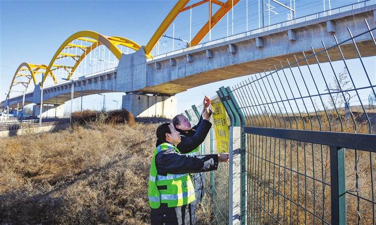 12月25日,太原市铁路护路联防应急中队队员们在尖草坪区司徒洼村附近,对大西高铁和北同蒲线重点路段更换护路安全宣传标识牌,同时向附近居民进行护路知识宣传。牛利敏 陈 璟 摄影报道