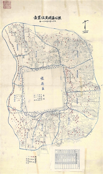 主讲人:太原战役是解放战争时期持续时间最长、战斗最激烈、伤亡最惨重的城市攻坚战。现在,我手中的这份珍贵档案,是1949年3月21日印制的《核心区碉点位置图》,我们可以直观地看出中心标识的城垣就是解放前夕的太原城,城垣中写“复廓区”三字。城的东西南北外围用蓝色笔划分10个区域,为10个要塞据点,分别为北部炼钢厂要塞、卧虎山要塞、双塔寺要塞、东部剪子湾要塞等。图中用红色空心圈标识碉堡和炮碉,蓝色空心圈标识新增碉堡和新增火力点。统计显示图中有碉堡321座、火力点297处。
