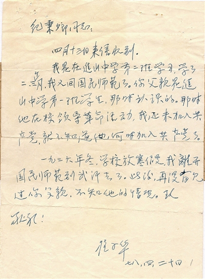 四月十三日来信收到。我是在进山中学第二班学习,学了二三个月,我又回国民师范了。你父亲是进山中学第一班学生,那时认识的。那时他在校领导革命活动,我还未加入共产党,就不知道他何时加入共产党了……