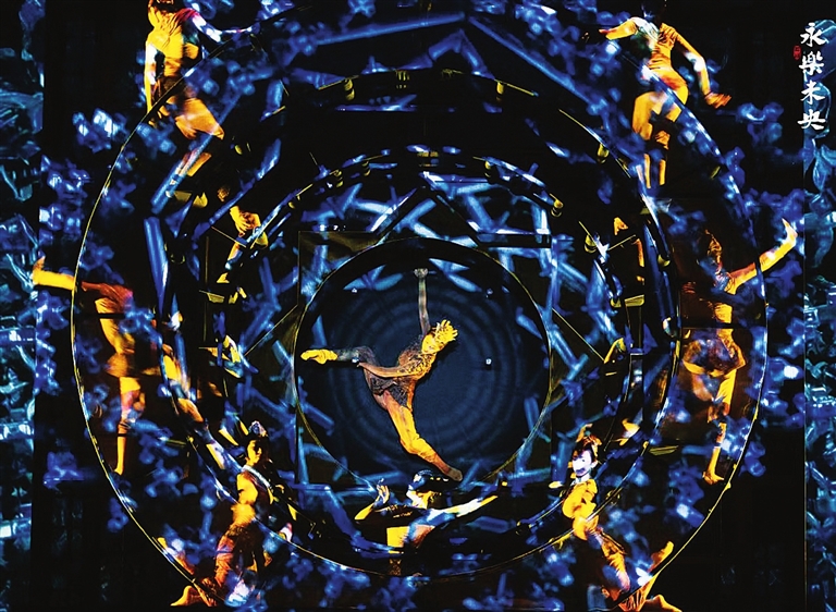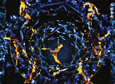 剧中多个核心舞段,又见“文物起舞”。“藻井群舞”段落,舞者们身着精美服饰腾挪起伏,手臂层叠交旋,以富有韵律的舞姿,复刻古建筑藻井从中心向四周辐射的层次感。“蓝釉角神”舞段,运用先进光影技术,让失传的孔雀蓝釉彩重现光芒。
