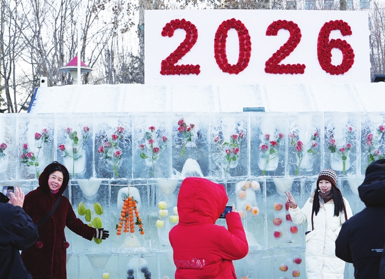2026年1月1日,在沈阳浑河外滩市集,市民在迎新年景观墙前打卡拍照。