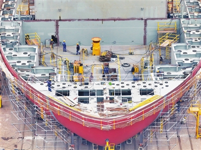 ❸1月4日,在江苏省南京市一船厂内,工人们抓紧完成船舶制造订单(无人机照片)。