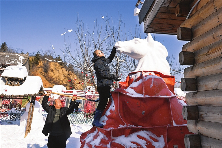 1月5日,杏花岭区采薇庄园内,工作人员制作马年雪雕。该景区以雪乡为主题,为游客打造梦幻雪世界。牛利敏 摄
