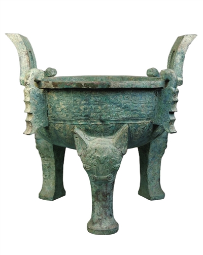 铜鼎形制宏大,两只立耳位于鼎最上方两侧,便于提携。鼎身口沿铸有四兽首扉棱,腹部上方饰有蟠螭纹和垂叶纹,三蹄足膝面作饕餮兽面。