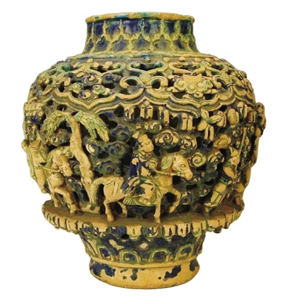 另一件是明代镂空堆塑人物故事珐华罐。罐高40.53厘米,口径16.72厘米,腹径35.42厘米。这件珐华罐釉色素雅,形体较大,胎体套烧、制作讲究,显得典雅大方。
