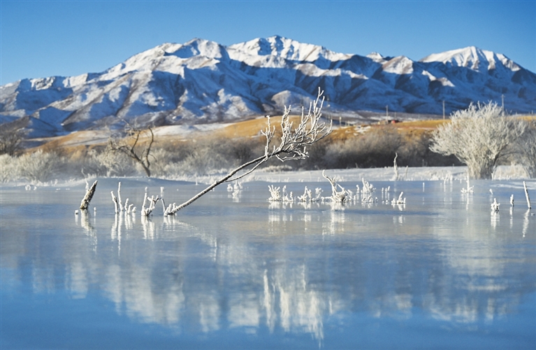 这是1月10日在青海省海北藏族自治州祁连县拍摄的雾凇景观。冬日时节,青海省海北藏族自治州祁连县出现雾凇景观,与祁连山的日出相映成趣,美如画卷。新华社记者 张 龙 摄