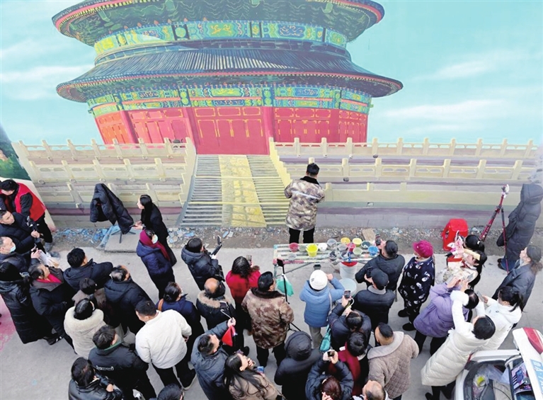 游客举着手机,围绕吴承言挤成了半圆形。镜头背后,数以万计的观众见证着又一幅墙绘作品的完成。