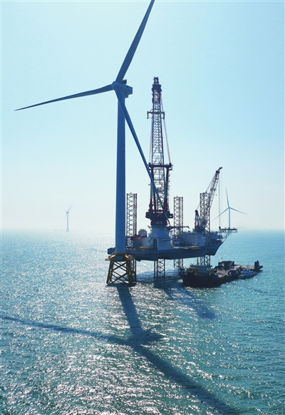 1月13日在闽南海域拍摄的“大桥海风”号2000吨自升式海上风电安装平台和吊装完成的20兆瓦海上风电机组(无人机照片)。该机组的成功吊装,是我国海上风电大容量机型应用的又一重要突破。新华社记者 林善传 摄