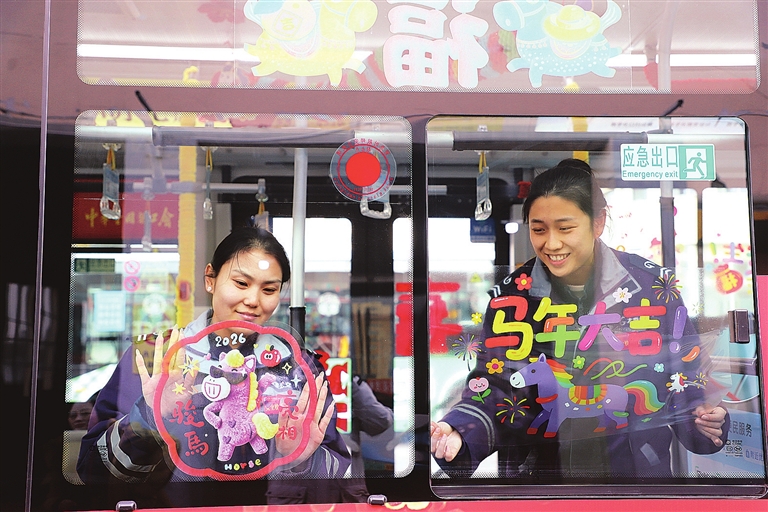 1月16日,太原公交第四分公司工作人员用马年主题装饰画、窗花等装点车辆,打造马年主题公交车,让广大乘客在通勤路上邂逅一份新春的欢喜。张昊宇 张澍宏 摄影报道