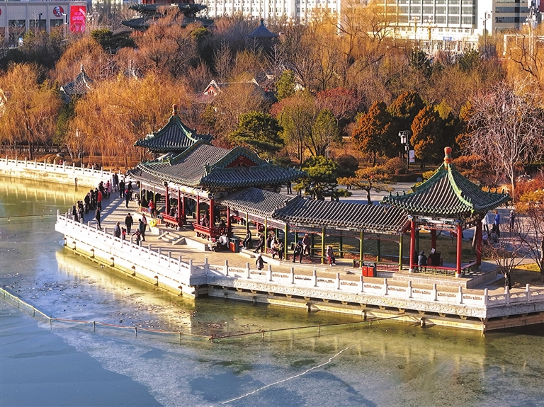 1月16日,迎泽公园沐浴在暖阳中,市民悠然散步,与园林景观构成一幅冬日画卷。王韵菲  摄