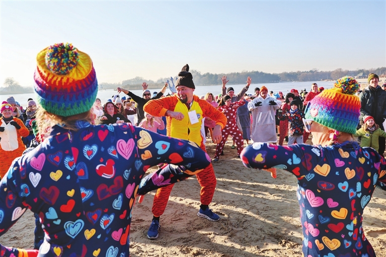 1月18日,在波兰大波兰地区奥斯特鲁夫,参与者在皮亚斯基-什奇格里奇卡水库参加首届冬泳爱好者“冰上睡衣派对”活动。新华社/欧新