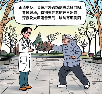 正值寒冬,中国中医科学院医学实验中心研究员代金刚建议,练习最好在室内,微汗即止;若在户外锻炼则需选择向阳、背风场地,特别要注意避开日出前、深夜及大风雨雪天气,以防寒邪伤阳。
