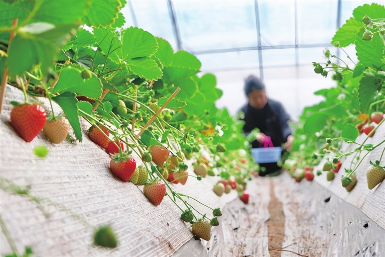 1月24日,小店区刘家堡乡东柳林村谷色天香采摘园草莓大棚内,工作人员在采摘当季草莓。该大棚引进“粉玉”新品种草莓,并严格按照国家绿色食品生产标准实施全流程种植管理,成为当地特色农业发展新亮点。王韵菲 摄