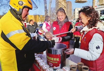 ▲ 1月25日,河北省秦皇岛市海港区海滨路街道开滦路社区开展“飘香腊八粥 温馨暖人心”活动。这是志愿者为网约配送员盛腊八粥。