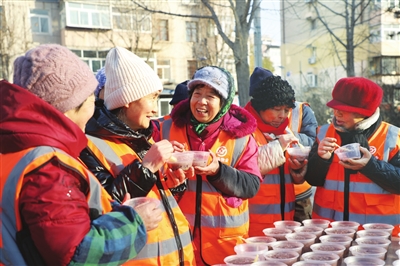 1月25日,在河北省唐山市丰润区燕山路街道欣园社区,环卫工人品尝志愿者送来的腊八粥。新华社发 (朱大勇 摄)