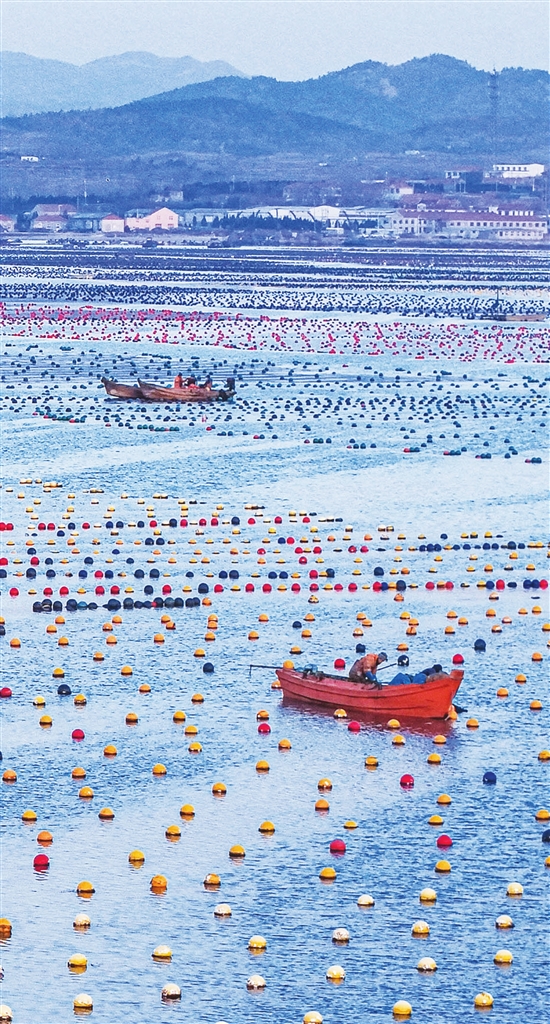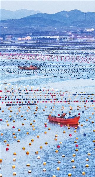 眼下,山东省荣成市小海带迎来收获季,养殖工人忙碌收获,投放春节市场。新华社发 (李信君 摄)