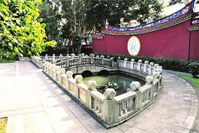 还有一个可比较的例子是孔庙和官学前的泮池。泮池是古代官学的标志,依古礼,天子太学中央有一座学宫,称为“辟雍”,四周环水,而诸侯之学只能南面泮水,故称“泮宫”,又称泮池。这是因为孔子自唐代受封文宣王,位同诸侯,所以建半圆的泮池为其规制。《诗经·泮水》篇有:“思乐泮水,薄采其芹……”等句,意指古时士子在太学,可摘采泮池中的水芹,插在帽缘上,以示文才。有的孔庙在池畔砖壁中央嵌着“思乐泮水”的石刻,便是出自这个典故。