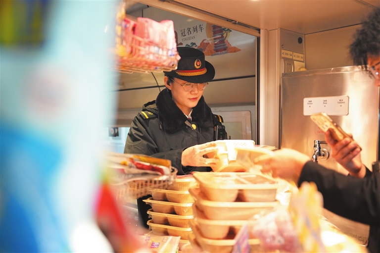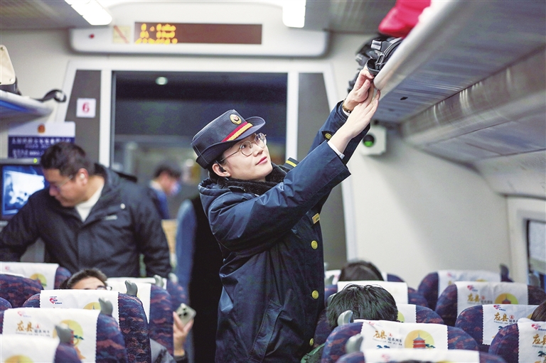 D1131次列车飞驰在轨道上。列车长温昕已在岗位上度过了9个春运。今年的春运,她依然在值乘。