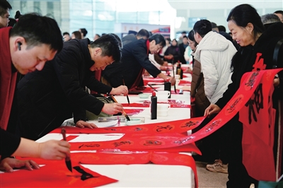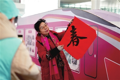 繁忙的太原南站,春运的热闹与暖意扑面而来。高架候车厅里,几位书法家挥毫泼墨,春联的墨香与朱砂红“福”字相映成趣。“晾干再装,到家就能贴!”志愿者刘禹含麻利地将春联递到务工者黄女士手中。“我准备回运城,往年挤绿皮车熬一夜,现在1个多小时就能到达,还能捎上春联,太贴心了!”