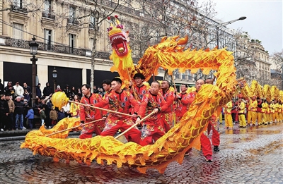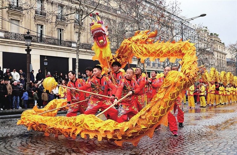 “欢乐春节满巴黎·龙狮贺岁舞香街”春节巡游活动2月1日在巴黎香榭丽舍大街举行,庆祝即将到来的农历春节。这是该活动第四次亮相香榭丽舍大街,由机器人引领的春节巡游表演方阵和紧随其后的舞龙舞狮、民族舞等传统表演,吸引了大街两侧的巴黎市民和游客驻足观看。新华社记者 张百慧 摄